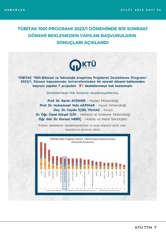 H A B E R L E R E Y L Ü L 2 0 2 3 S A Y I 9 5 TÜBİTAK 1001 PROGRAMI 2023/1 DÖNEMİNDE BİR SONRAKİ DÖNEMİ BEKLEMEDEN YAPILAN BAŞVURULARIN SONUÇLARI AÇIKLANDI KTÜ TTM 7